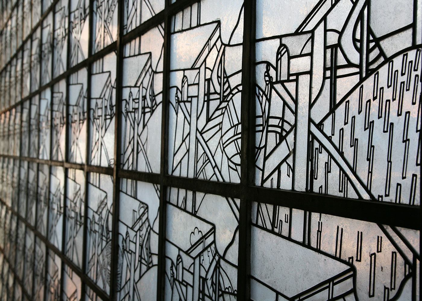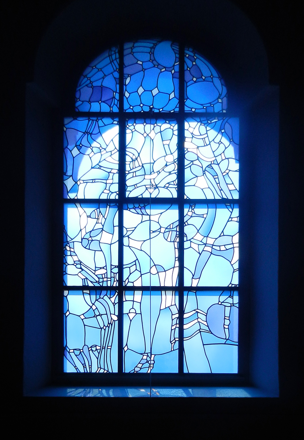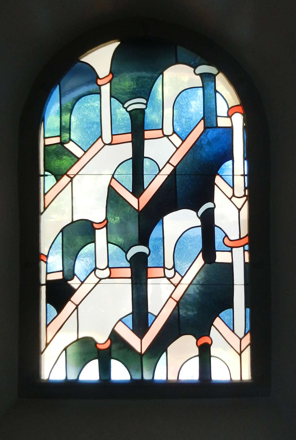 Die gegenüberliegende Fensterfront ist in opaken Weißgläsern gehalten.