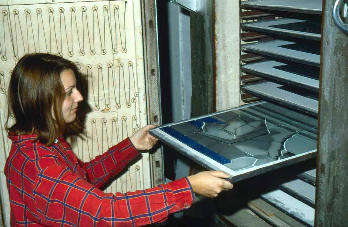 12 | Das Blech wird in den Brennofen geschoben und auf 620° bis zum Schmelzpunkt erhitzt.