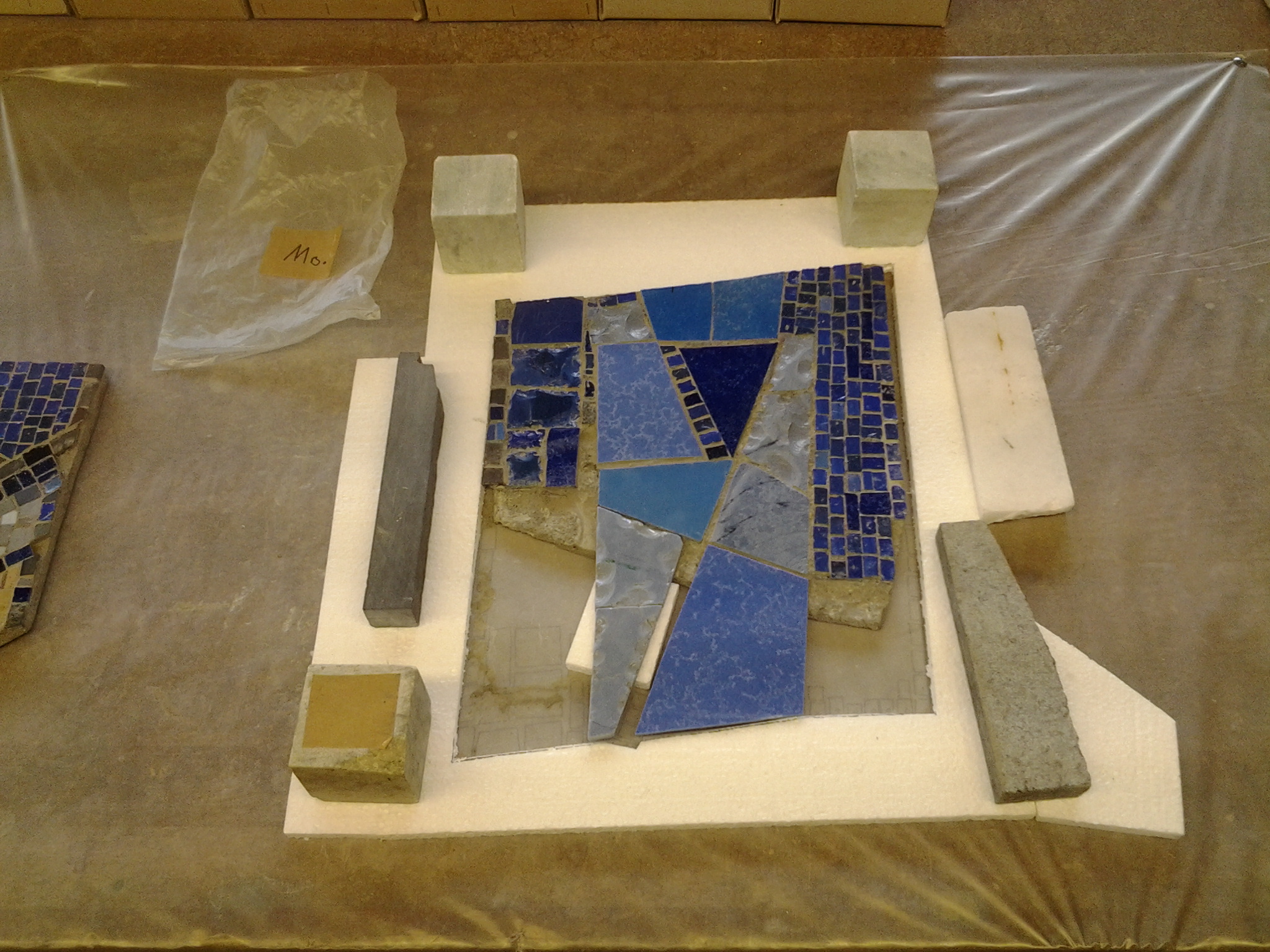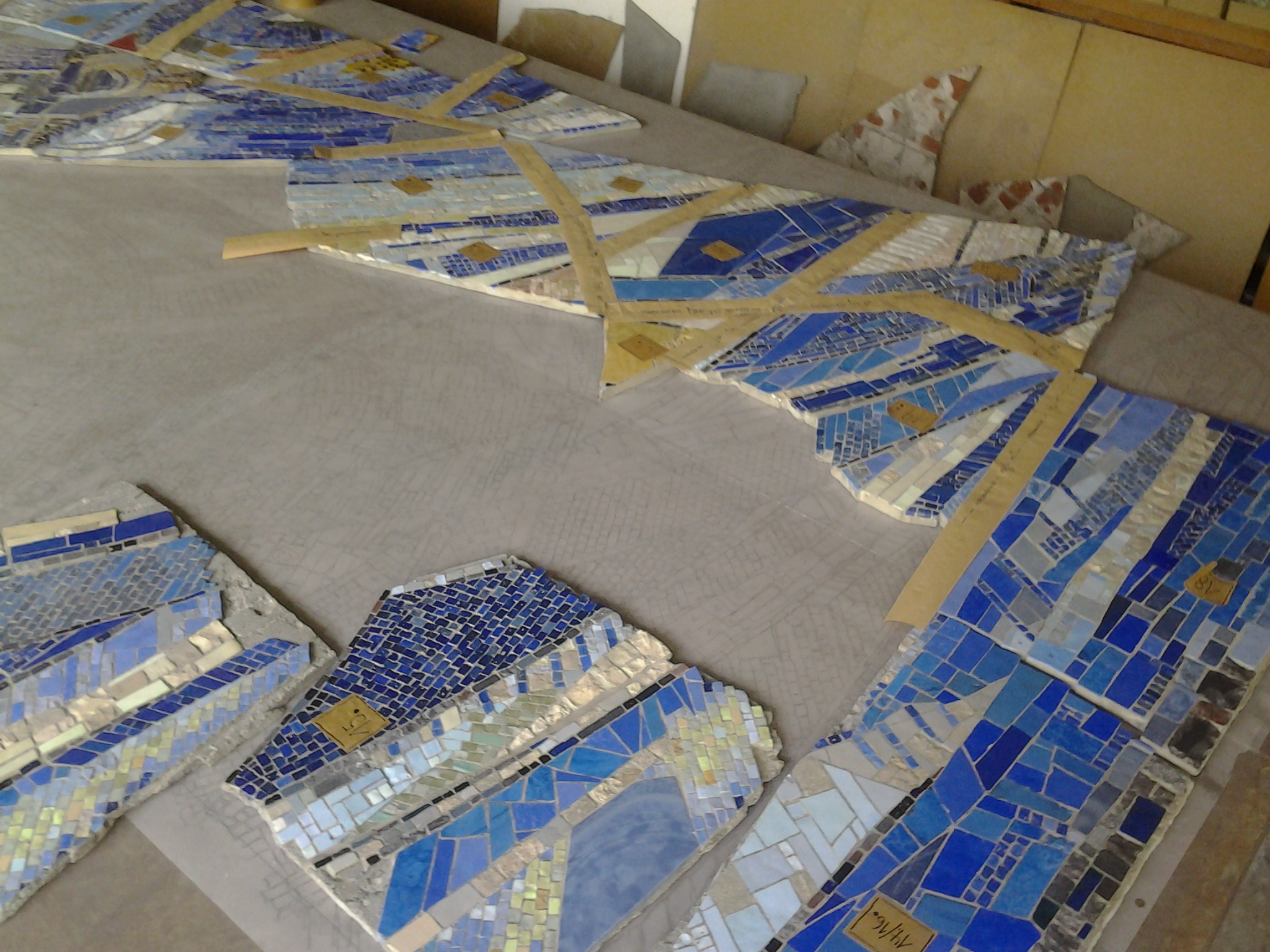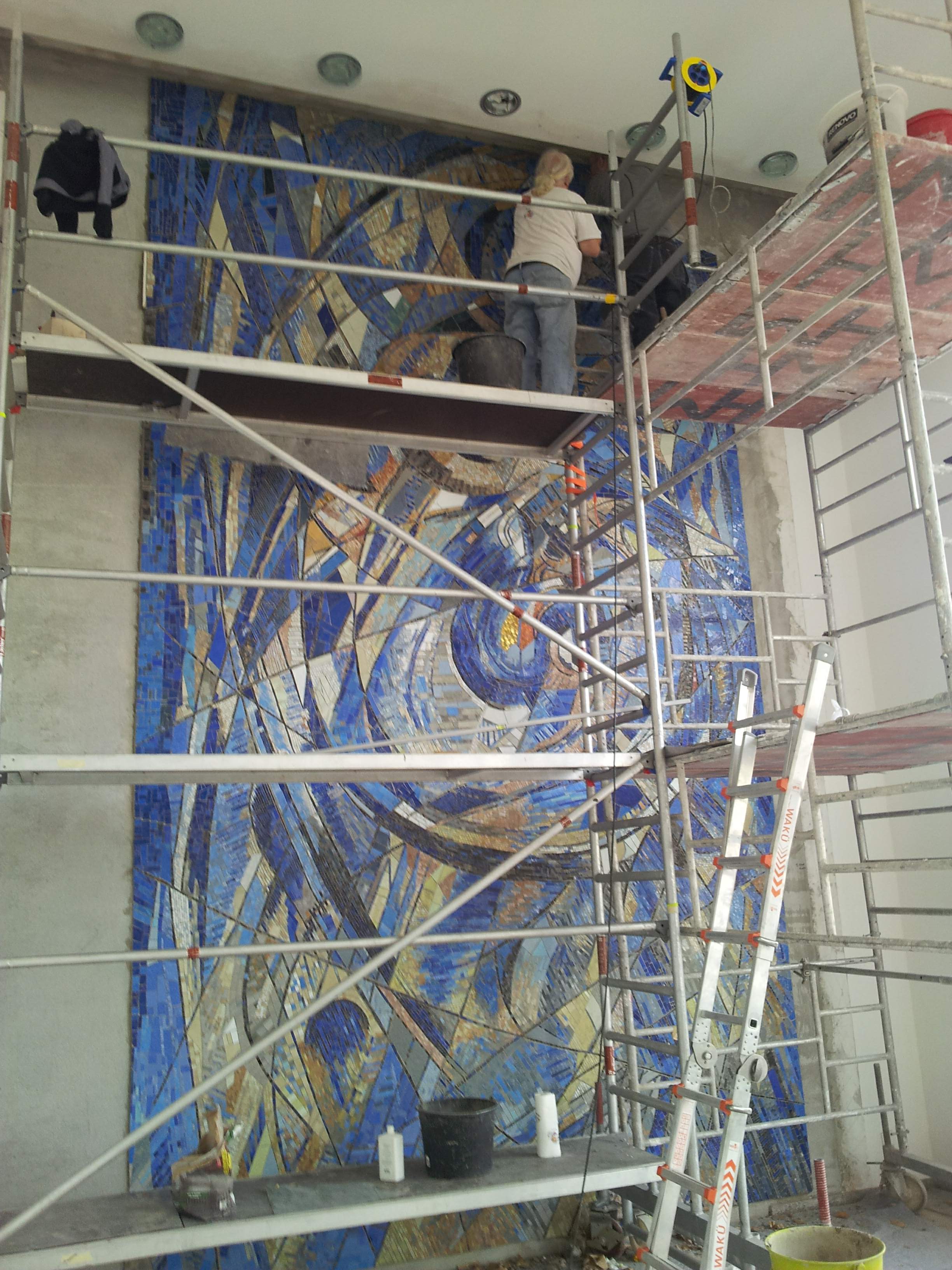 Im Spiralnebel setzte er unzählige größere und kleinere Keramik- und Glassteinchen so zusammen, dass die dynamische Spiralbewegung deutlich erkennbar wird. Auch wenn die blaue Farbe dominiert, komponiert er geschickt mit der Abgrenzung zu helleren Farben bzw. wenigen roten Farbakzenten im Zentrum. Je nahsichtiger man das Mosaik betrachtet, desto vielfältiger wird das Spiel mit Formen und Farben der gewählten Glasmosaiksteine, in das sich auch wenige Natursteine einfügen.