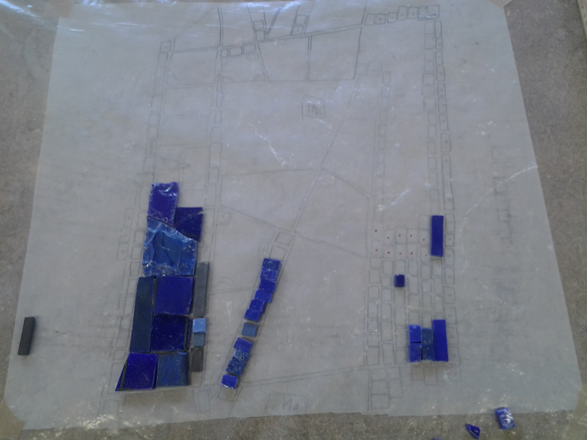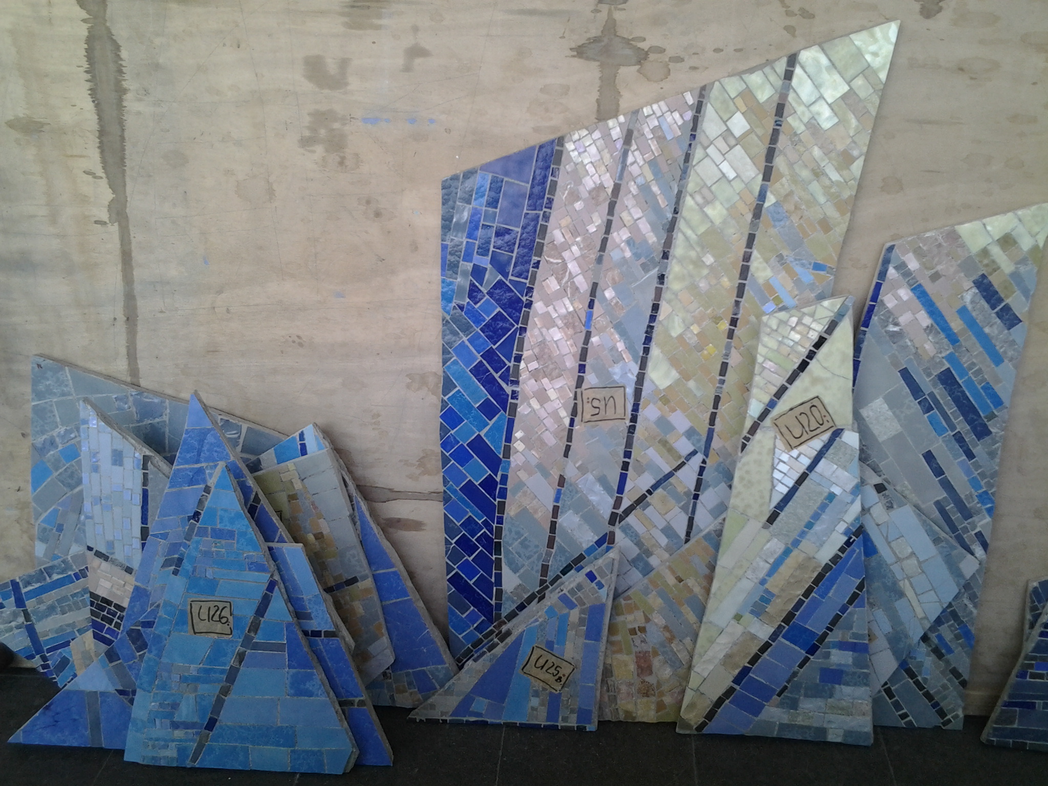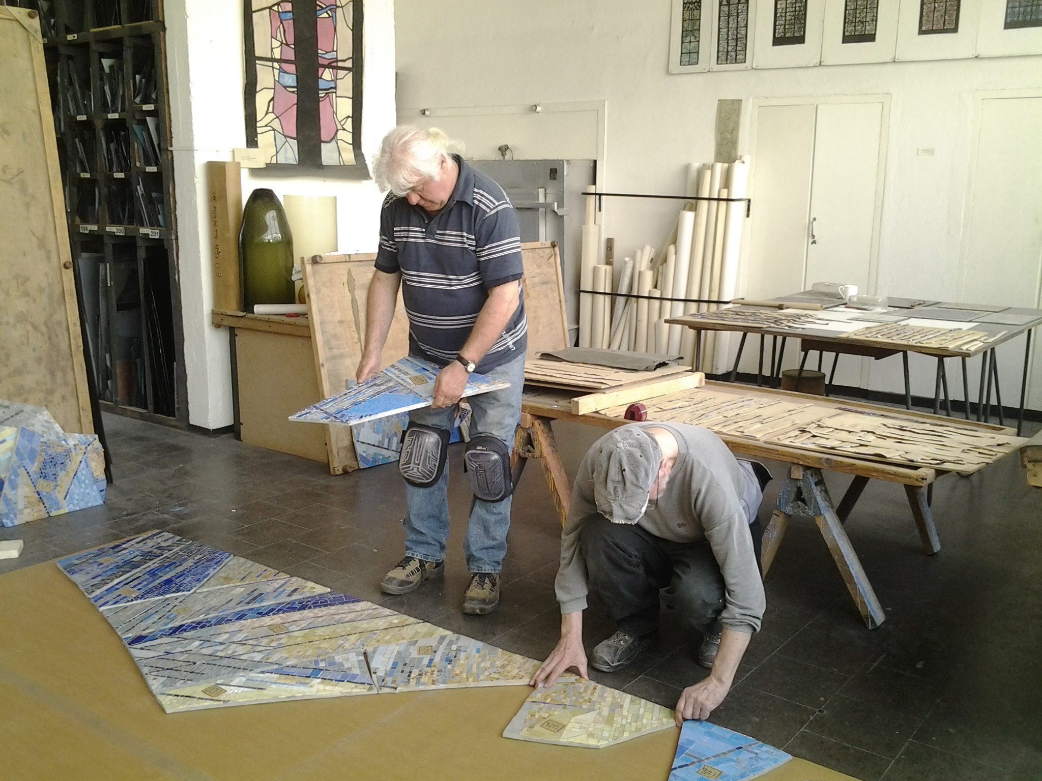 Im Spiralnebel setzte er unzählige größere und kleinere Keramik- und Glassteinchen so zusammen, dass die dynamische Spiralbewegung deutlich erkennbar wird. Auch wenn die blaue Farbe dominiert, komponiert er geschickt mit der Abgrenzung zu helleren Farben bzw. wenigen roten Farbakzenten im Zentrum. Je nahsichtiger man das Mosaik betrachtet, desto vielfältiger wird das Spiel mit Formen und Farben der gewählten Glasmosaiksteine, in das sich auch wenige Natursteine einfügen.