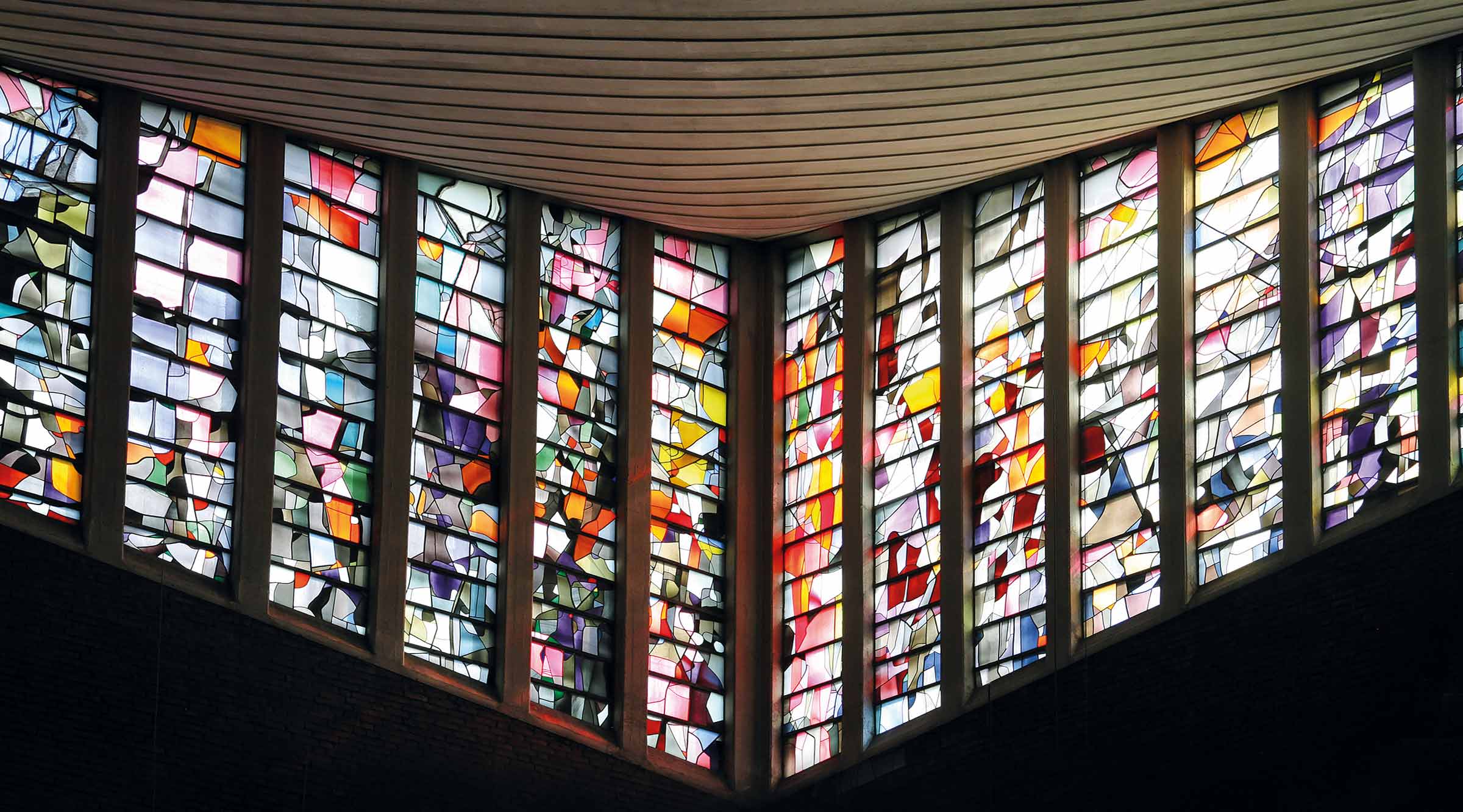 Die Glasmalerei von Hubert Berke spannt sich als umlaufendes Band am oberen Abschluss um die gesamte Kirche. Im Chor noch ganz schmal, wächst das Glasband an den Seiten langsam an, um in zwei großen Trapezen, die sich fast zu einem Dreieck ergänzen, an der Westwand mächtig zusammenzulaufen.