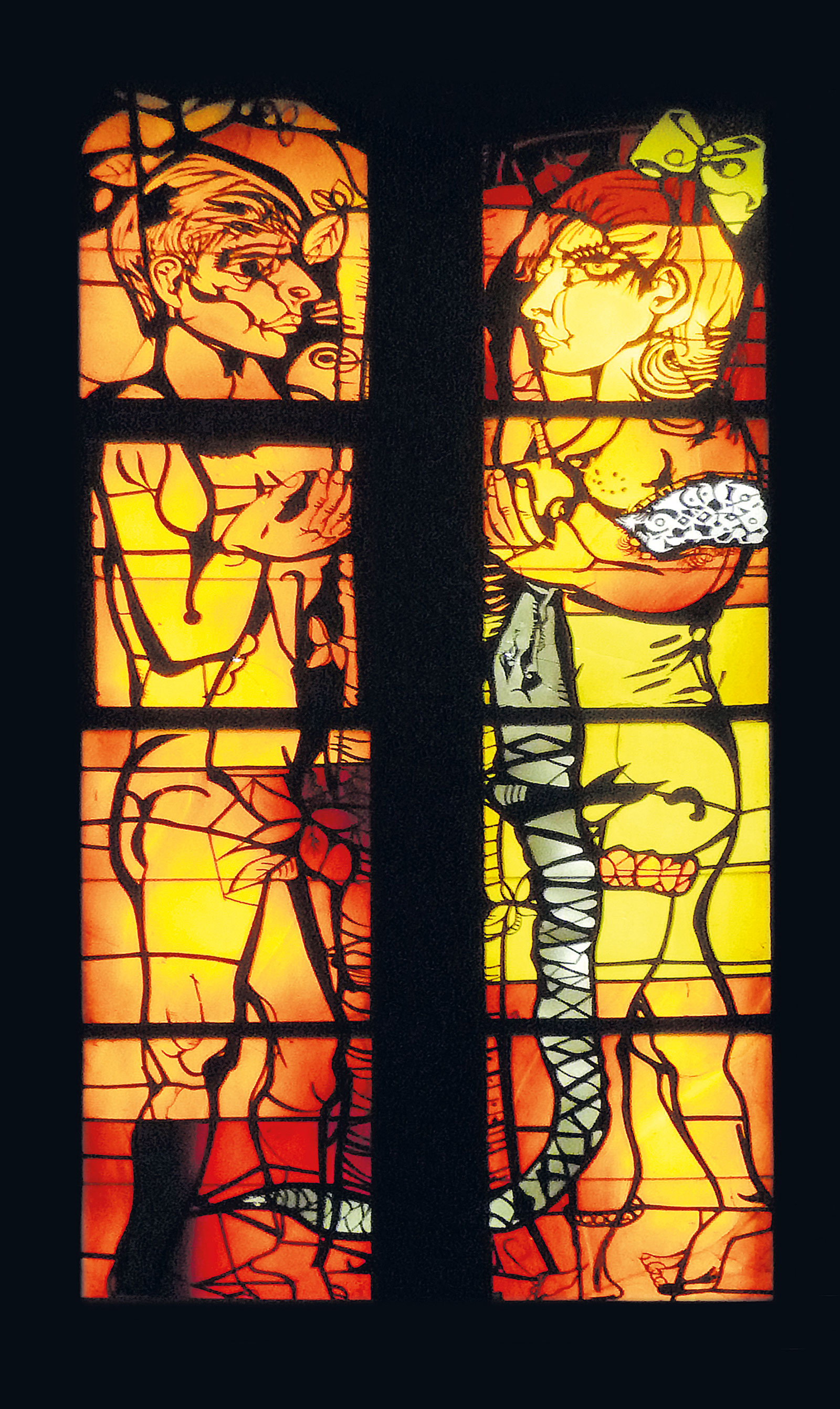 Die figürlichen Darstellungen erinnern an sein zeichnerisches Werk und sind sehr expressiv im Ausdruck. Auffallend ist bei allen Fenstern, dass die Farbigkeit der einzelnen Scheiben vollkommen losgelöst von der Konturierung der Motive ist. Sowohl Zeichnung als auch Farbgläser führen ein Eigenleben, finden sich aber am Ende eindrucksvoll zusammen.