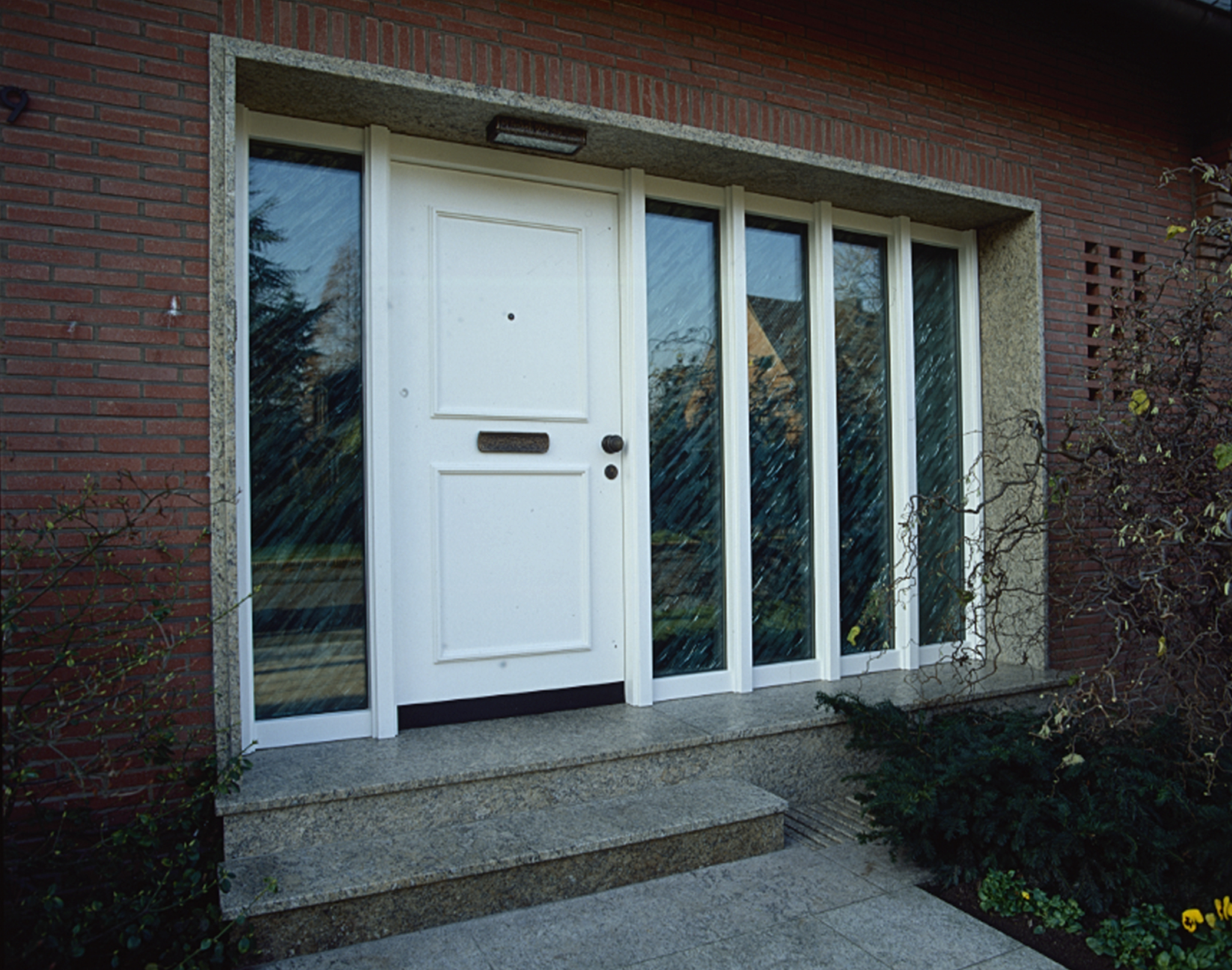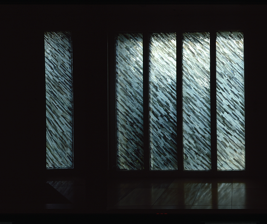 Kein Einblick – Eingangsbereich eines Privathauses. Detail einer Glascollage – Echtantikglas geschichtet in Weiß- und Grautönen Innenansicht des Eingangsbereiches Außenansicht – mehrteilige Glascollage in der Fassade eines Privathauses
