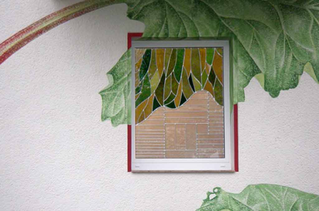 Glas- und Wandmalerei im Dialog Bleiglasfenster als Teil der bemalten Hauswand | Sicht von innen Bleiglasfenster als Teil der bemalten Hauswand | Sicht von außen